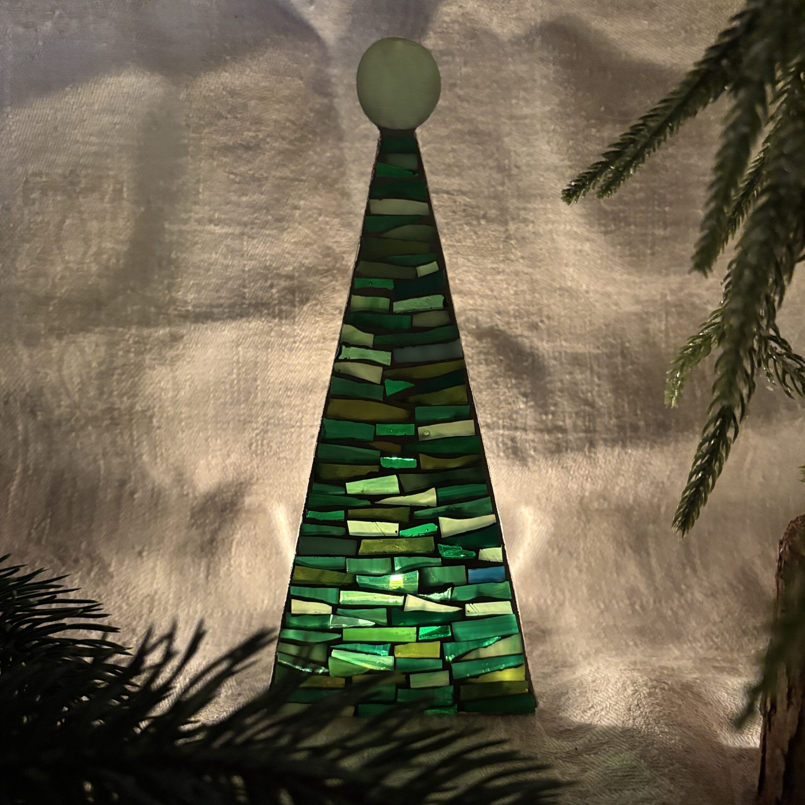 Négyzet alakú mécsestartó elejére üveglapra készült a karácsonyfa motívum kézzel vágott spektrum üveg darabokból.