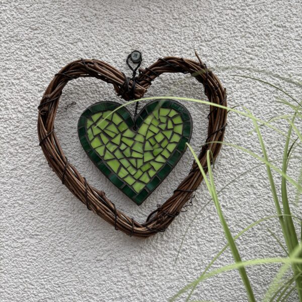 Szív alakú lefestett fa alapra ragasztottam fel a motívumot üvegmozaik technikával, kézzel vágott spektrum üvegekből, majd dróttal egy akasztható szív alakú vesszőfonatra erősítettem.